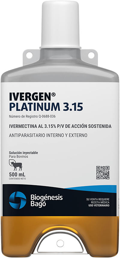 Antiparasitario interno y externo para bovinos, que combate los parásitos gastrointestinales, pulmonares, sarna, piojos, ura y miasis. Solución inyectable de Ivermectina 3,15% formulada especialmente para alcanzar una acción sostenida y eficaz en el ganado bovino. La larga acción del producto facilita el manejo, reduciendo los movimientos del ganado, al alargar el período entre un tratamiento y otro.