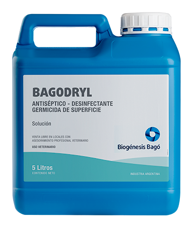 Desinfección externa prequirúrgica: 1:2.000 (1 mL en 2 L). Desinfección de instrumental quirúrgico: 1:200 (5 mL en 1 L). Desinfección externa de animales y ubres en el tambo: 1:2.000 (1 mL en 2 L). Desinfección de bebederos: 1:10.000 (1mL en 10 L). Desinfección de instalaciones, máquinas, utensilios y superficies contra el virus de influenza tipo A H1N1:1:200 (5 mL en 1 L o 50 mL en 10 L). Desinfección de materiales, dispositivos y áreas genitales en sistemas de inseminación artificial:1:200 (5 mL en 1 L o 50 mL en 10 L). Agregar los mL necesarios de BAGODRYL en agua, mezclar y el producto estará listo para usar.